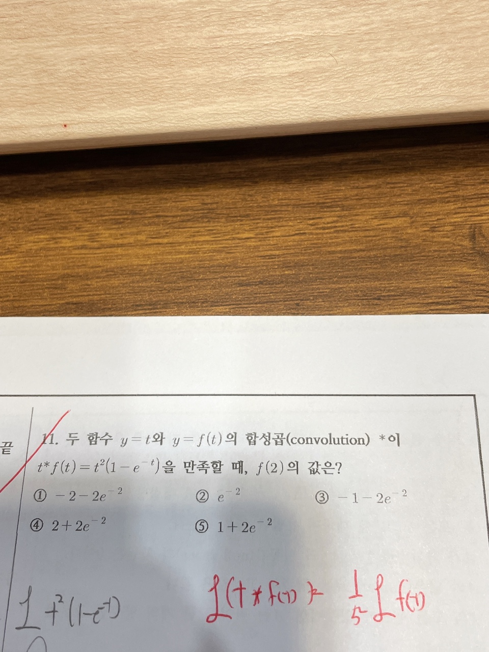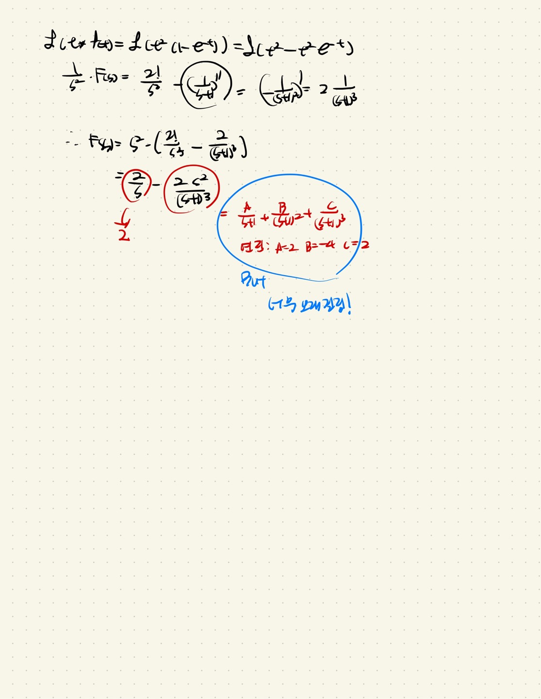아래 빨간식으로 양변 라플라스 취하면 s제곱분의1라플라스f 하고 양변에 s제곱 을 곱하면 s분의2-s+1세제곱분의2s제곱 나오는데 s분의2는 그냥 2로 라플라스가 되고 s+1세제곱분의2s제곱을 어떻게 라플라스해야할지 모르겠습니다