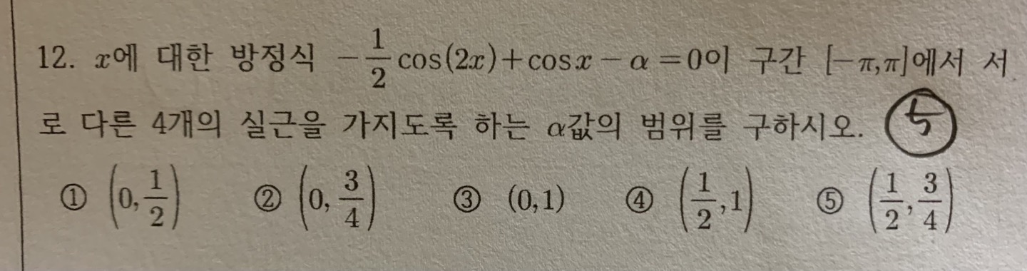 선생님 안녕하세요~ 교재 내용은 아니지만 기출문제를 풀던중 2문제를 질문드립니다. 우선 아래 문제는 제 머리로는 이렇게 밖에 풀이가 안됩니다 ㅠㅠ 함께 풀어주시면 감사하겠습니다.  아래 문제는 서로 다른 4개의 실근이 나올 수 있는건지 일단 cosθ 값이 2개 나오면 그에 따라 θ값이 4개가 되어서일까요!? 함께 풀어주시면 감사하겠습니다. (아래 적혀있는 번호는 제가 풀어 체크한 것이니 유념치 마셔요 ㅠㅠ)