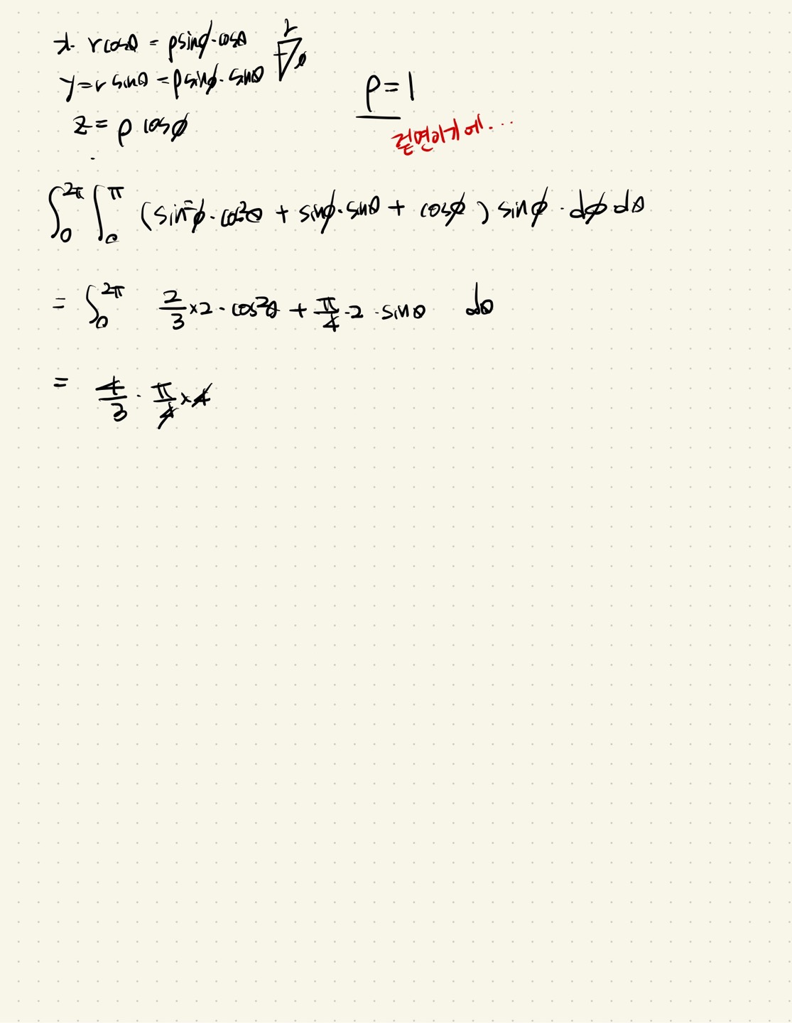 | 올려주신 파일중 20편입수학 모의고사 9번 문제에 구면좌표계로 풀때 로(p)는 미리 넣어서 계산이 되었던데 왜그러는지 궁금합니다! |