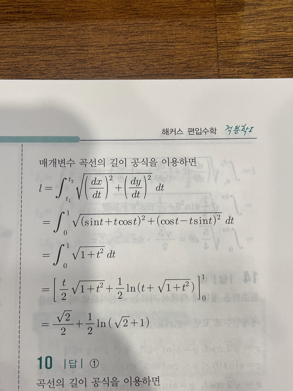 곡선의 길이 출제예상문제 264쪽 9번문제 질문드립니다