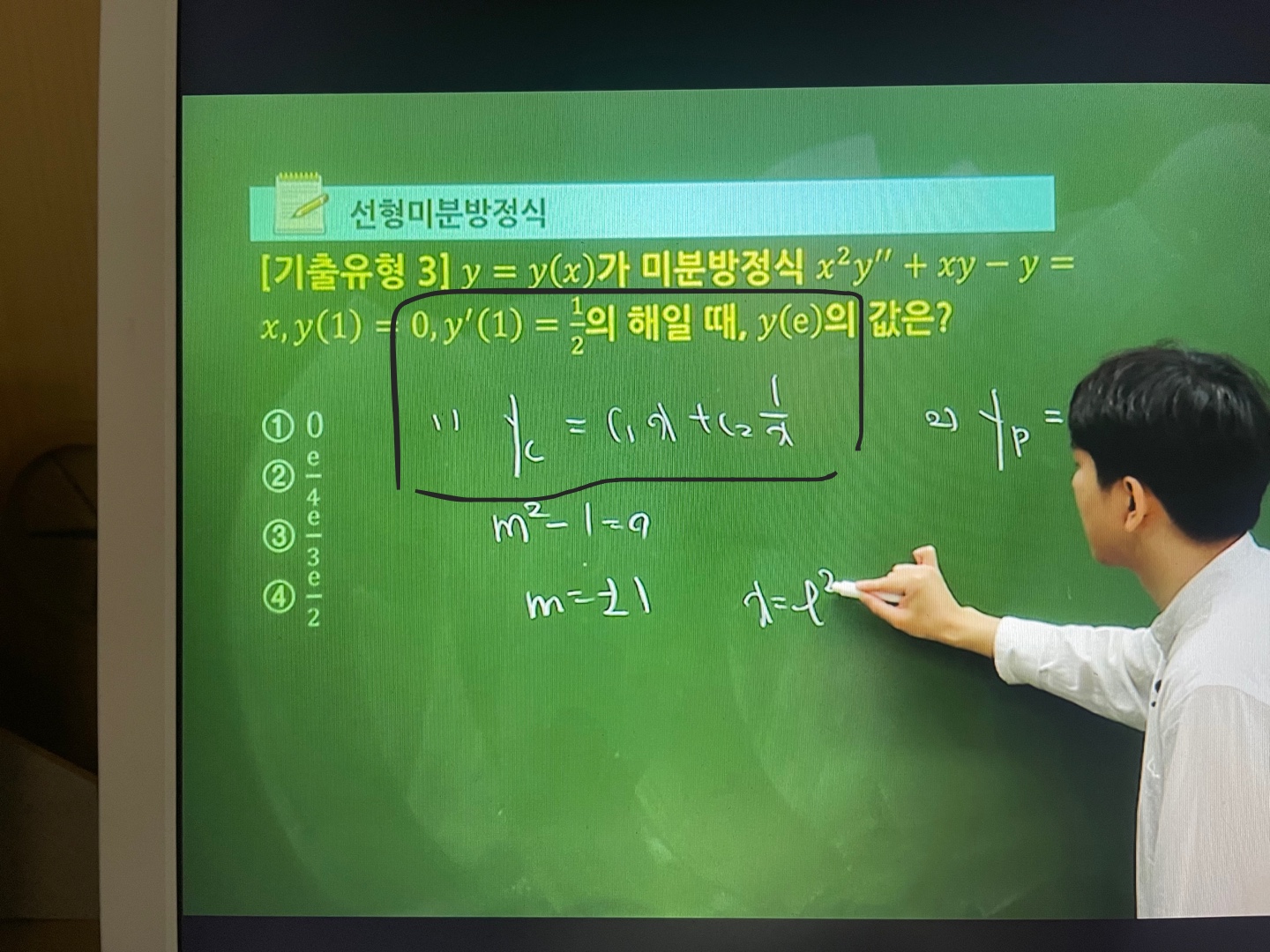 네모친거에서 보조해를 구하는데 중근이니까 (c1+c2lnx)x^알파로 풀면 c1x+c2xlnx 아닌가요? c1x+c2(1/x)가 어떻게 나온건가요 ㅠㅠ