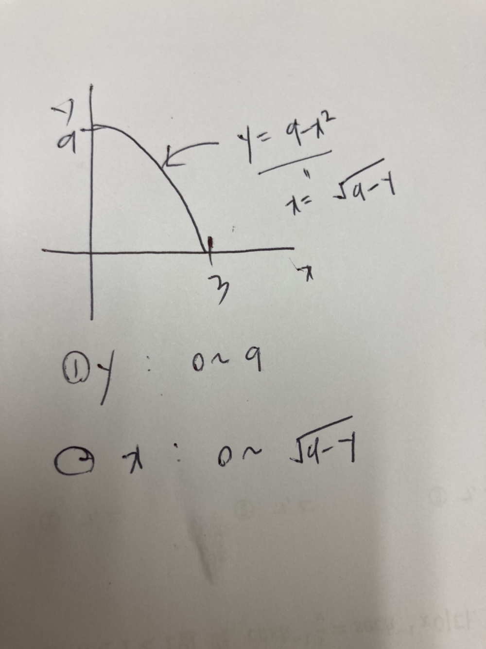 이걸 반대로 y부터 보면 0~9 x 0~루트(9-y) 입니다
