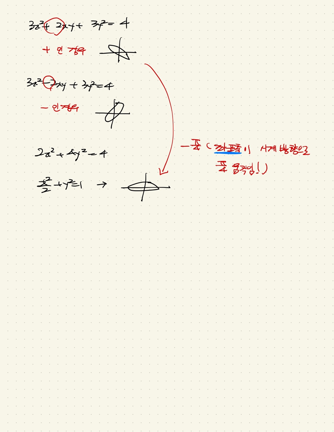 이차형식 타원에서 xy 에 + 인 경우는 장축이 왼위에서 아래로 - 인 경우는 오윈에서 아래로 세워집니다.