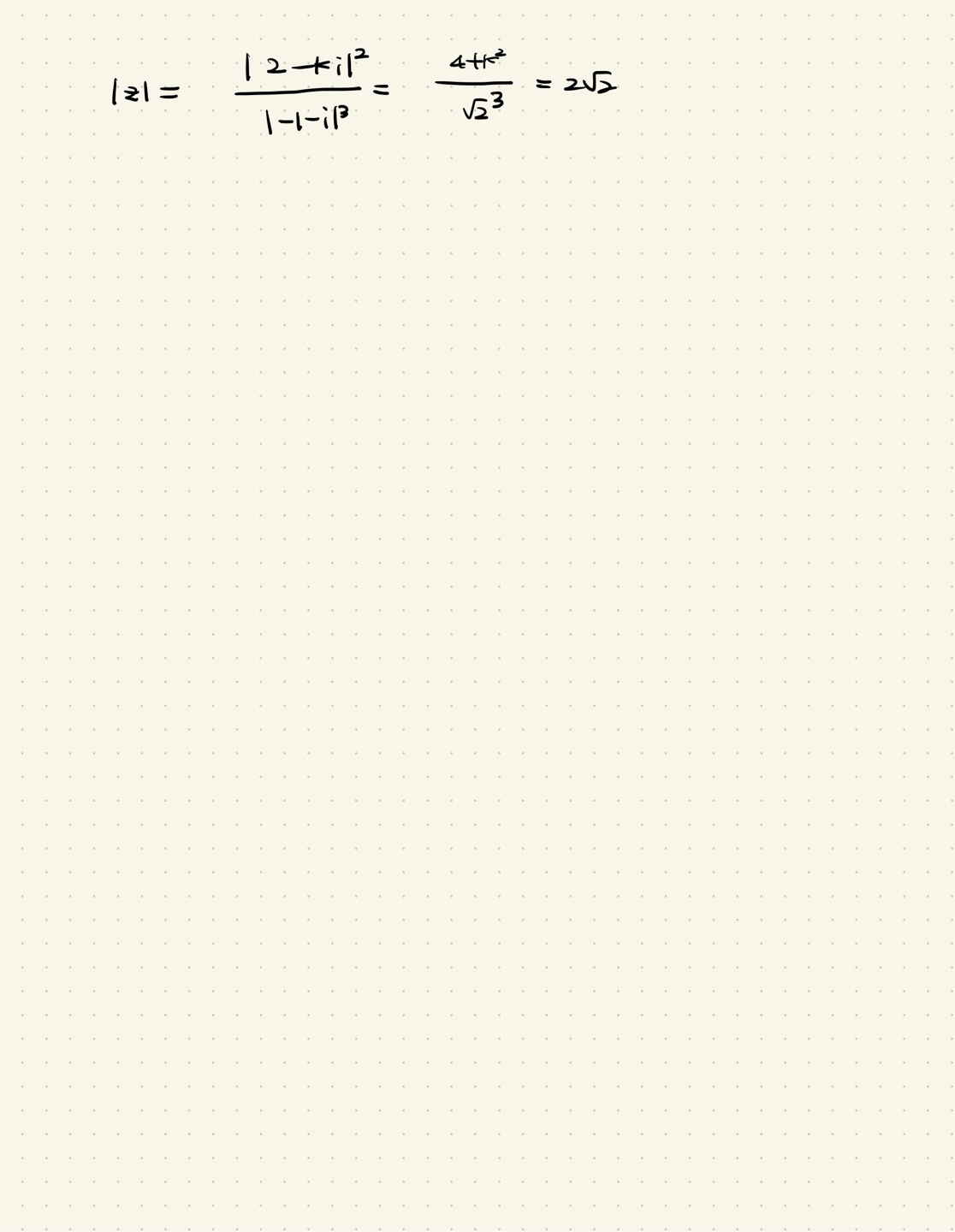 복소수의 절대값 성질을 이용한 것입니다. 그냥 유리화하고 전개식 늘어놓으면 식이 굉장히 복잡해서 계산이 힘듭니다. 문제 주어진 조건 z의 크기 즉 절대값이 2루트2 이기 때문에 계산하신 것에 루트(실수부분제곱+허수부분제곱)를 해야합니다.