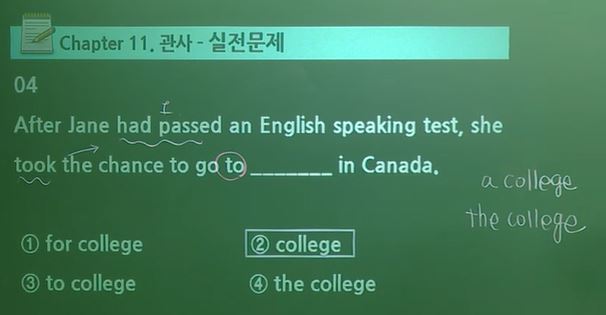 물론 특정 대학에 간다면 went to the college도 맞지만 빈칸의 문제는 best의 답안을 찾는 것이기 때문에 둘 중에 더 적절한 답은 college가 됩니다.