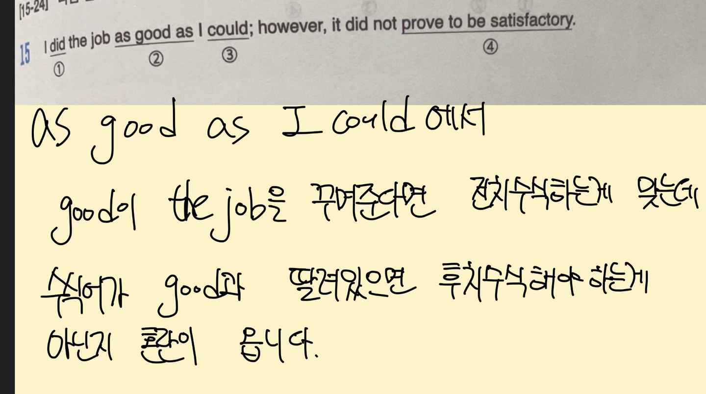 용호 학생 반가워요 :) 1. 첫번 째 질문에 답변을 안했길래 다시 수정해서 남깁니다. I did the job (as) good (as I could); however, it did not prove to be satisfactory. good이 job을 꾸며준다면 the good job의 형태가 되어야 합니다. 여기서 'as ~ as 주어+can'부분은 수식어로 위와 같이 괄호 처리를 하고 생각하면 됩니다.