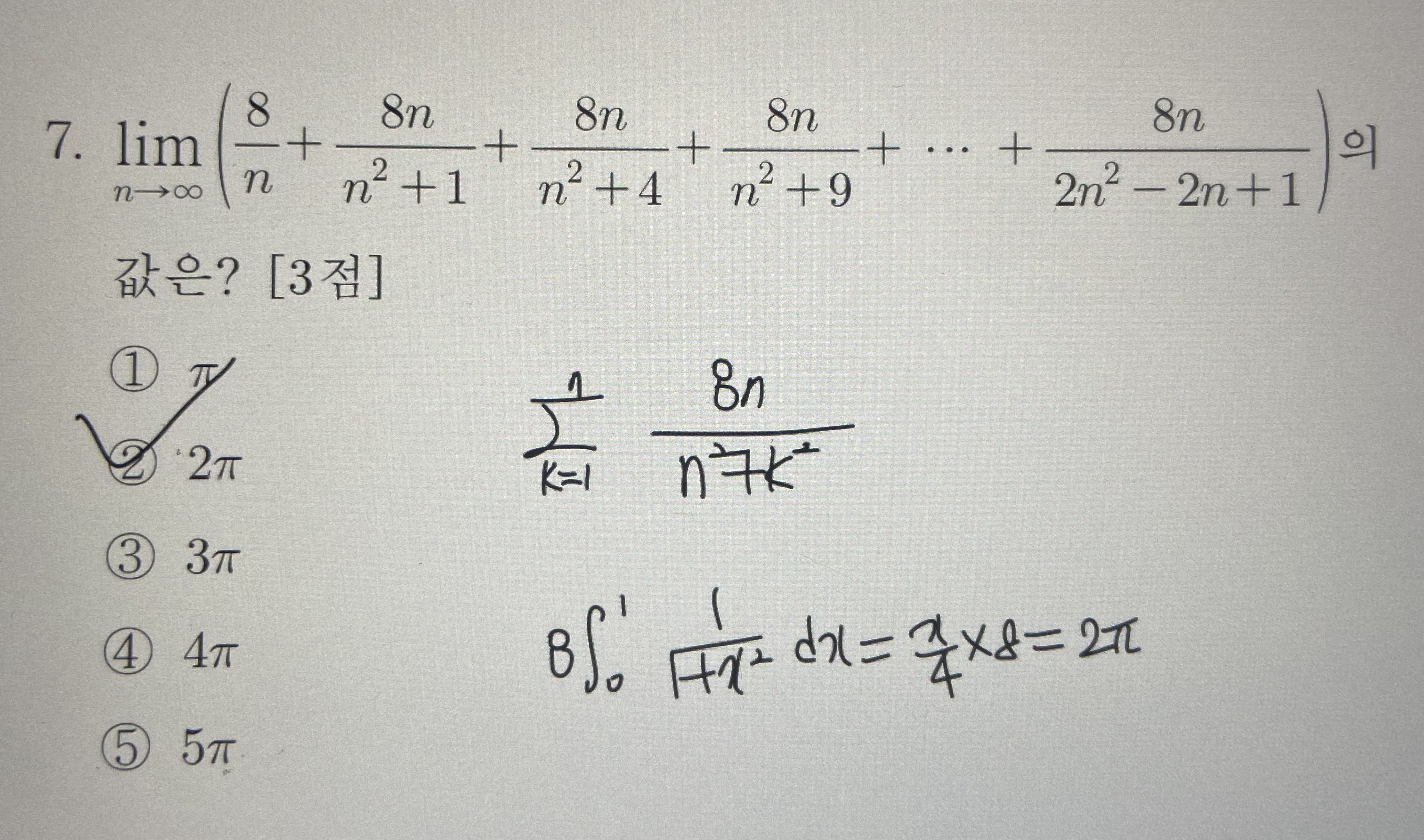 이 문제 무한 급수와 정적분으로 푸는 문제가 맞을까요?? 마지막 항 때문에 일반항을 어떻게 잡고 풀어야 할지 모르겠습니다. (경희대 2021 기출입니다! 혹시 경희대도 해설 강의를 해주시나요?) |